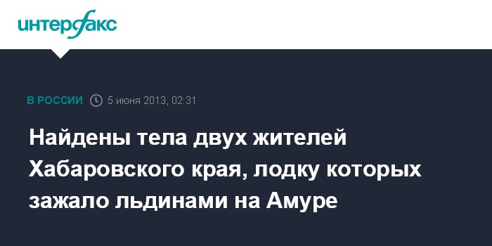 Хабаровск. 5 июня. ИНТЕРФАКС-ДАЛЬНИЙ ВОСТОК - Сотрудники полиции города Николаевск-на-Амуре (Хабаровский край) обнаружили тела двух местных жителей, утонувших 17 мая при попытке пересечь реку Амур на лодке во время ледохода, сообщает пресс-служба УМВД по региону в среду.