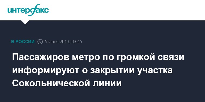 Москва. 5 июня. INTERFAX.RU - Пассажиров метрополитена по громкой связи предупреждают о закрытии участка Сокольнической линии.