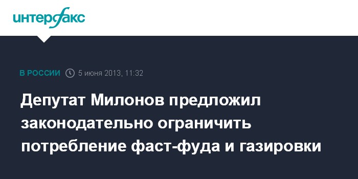 Депутат Милонов предложил законодательно ограничить потребление фаст-фуда и газировки