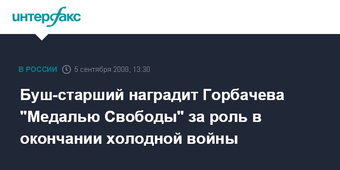 "Михаил Сергеевич удостоен этой медали за мужественную роль в окончании холодной войны. Награду ему вручит экс-президент США Джордж Буш-старший. В церемонии также примет участие госсекретарь США Кондолиза Райс", - отметили в пресс-службе Горбачева.