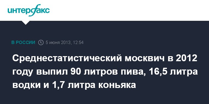 Среднестатистический москвич в 2012 году выпил 90 литров пива, 16,5 литра водки и 1,7 литра коньяка