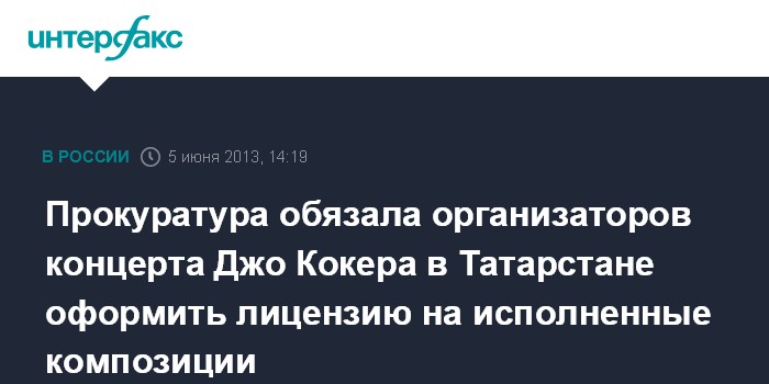Казань. 5 июня. INTERFAX.RU - Организаторы концерта мировой звезды рок-музыки Джо Кокера по требованию прокуратуры заключили лицензионный договор с "Российским авторским обществом" на выступление певца в Казани (Татарстан). На сайте Генпрокуратуры РФ говорится, что концерт должен состояться в среду в помещении концертного зала "Татнефть-Арены".