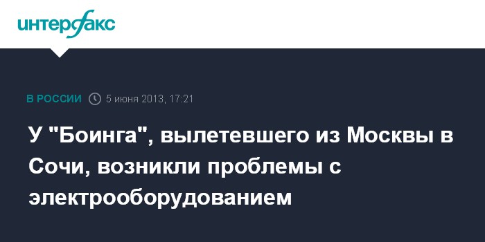 Москва. 5 июня. INTERFAX.RU - Пассажирский "Боинг" авиакомпании "Трансаэро", вылетевший из "Домодедово" в Сочи, возвращается в аэропорт вылета из-за проблем с электрооборудованием, сообщил "Интерфаксу" источник в авиадиспетчерских службах московского авиаузла.