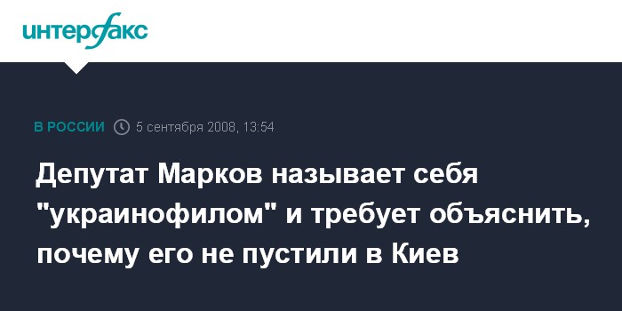 Киев. 5 сентября. INTERFAX.RU - Депутат Госдумы РФ Сергей Марков намерен обратиться к уполномоченному Верховной Рады по правам человека Нине Карпачевой для того, чтобы выяснить причину, по которой его не пустили на Украину.