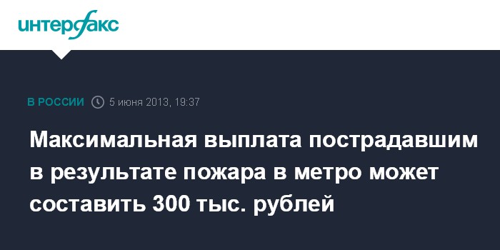Максимальная выплата пострадавшим в результате пожара в метро может составить 300 тыс. рублей