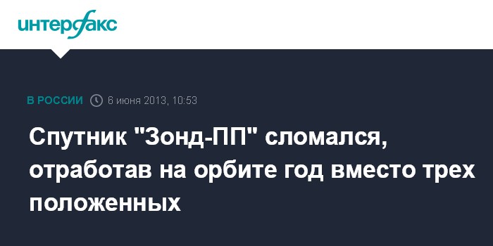 Москва. 6 июня. INTERFAX.RU - Малый космический аппарат "Зонд-ПП", запущенный в июле 2012 г., вышел из строя, проработав год вместо трех запланированных, сообщил "Интерфаксу" в четверг источник в ракетно-космической отрасли.
