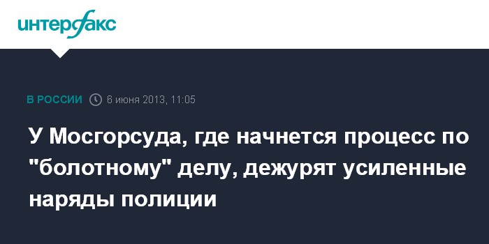 Москва. 6 июня. INTERFAX.RU - Полиция усилила меры безопасности у здания Мосгорсуда, где в четверг начнется рассмотрение уголовного дела в отношении 12 предполагаемых участников массовых беспорядков 6 мая 2012 г. на Болотной площади.