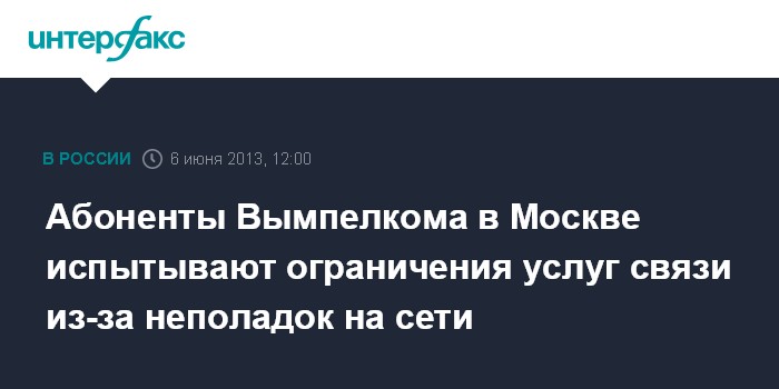 Москва. 6 июня. INTERFAX.RU - ОАО "Вымпелком" (ограничило предоставление услуг связи в пределах Садового кольца Москвы из-за неполадок на сети.