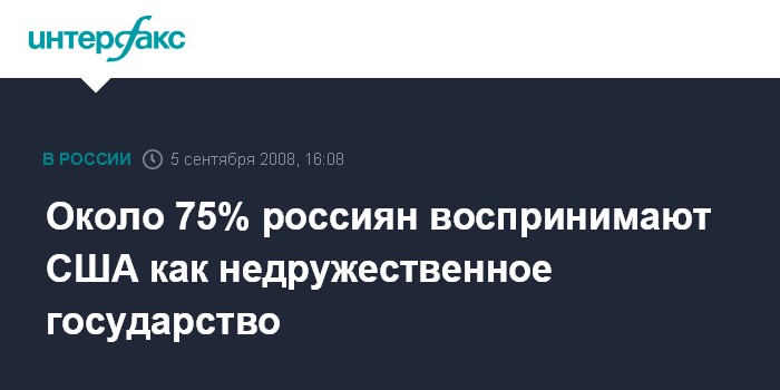 Москва. 5 сентября. INTERFAX.RU - Исследования социологов Фонда "Общественное мнение" показывают, что порядка 75% россиян сегодня считают США государством, недружественным по отношению к России. По словам ученых, так высоко этот показатель в XXI веке еще не поднимался - прежний максимум - 71% - был зафиксирован в начале марта 2002 г. на фоне скандалов по поводу судейства на зимней Олимпиаде в США.