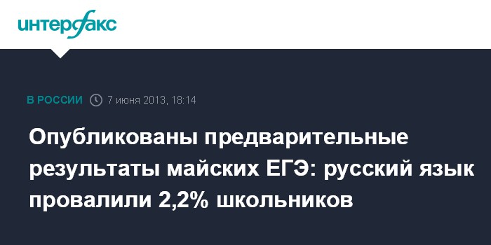 Согласно сообщению ведомства, поступившем в "Интерфакс" в пятницу, не сдали ЕГЭ по русскому языку 2,2% выпускников текущего года - их результат оказался ниже минимальной границы в 36 баллов. Между тем, результаты экзамена по этому предмету влияют на получение аттестата.
