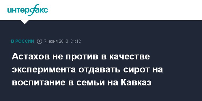 Астрахань. 7 июня. INTERFAX.RU - Уполномоченный по правам ребенка при президенте РФ Павел Астахов высказался за проведение эксперимента по передаче детей-сирот в семьи в северокавказские республики из других регионов России.
