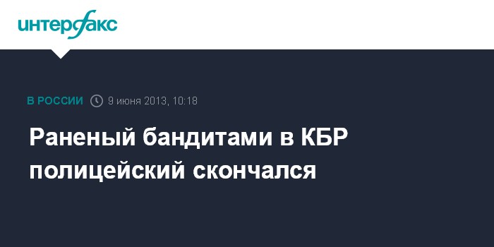 Москва. 9 июня. INTERFAX.RU - Сотрудник полиции, раненый в ночь на воскресенье в ходе вооруженного нападения на наряд патрульно-постовой службы в Кабардино-Балкарии, умер в больнице, сообщил "Интерфаксу" источник в правоохранительных органах. "От полученных во время обстрела ранений полицейский скончался в больнице", - сказал собеседник агентства.