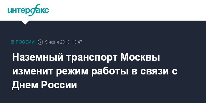 Москва. 9 июня. INTERFAX.RU - Департамент транспорта и развития дорожно-транспортной инфраструктуры столицы предупреждает об изменении режима работы наземного городского пассажирского транспорта в связи с мероприятиями, посвященными празднованию Дня России 12 июня. "11 июня городской наземный транспорт будет работать по расписанию вторника, 12 июня - по расписанию воскресенья", - сообщили "Интерфаксу" в пресс-центре департамента в воскресенье.
