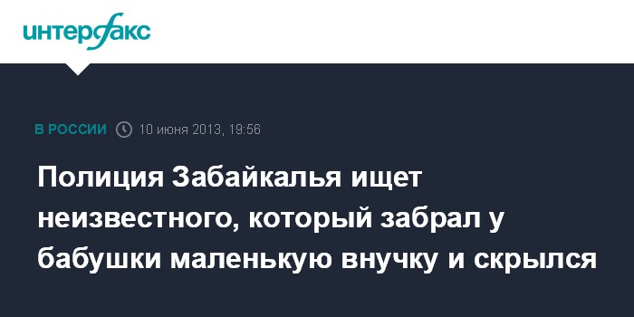 Чита. 10 июня. INTERFAX.RU - Полицейские Забайкальского края разыскивают неизвестного, который в селе Мирсаново забрал у бабушки трехлетнюю внучку и скрылся, сообщили агентству "Интерфакс" в пресс-службе краевого УМВД.