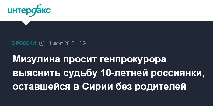 Москва. 11 июня. INTERFAX.RU - Глава думского комитета по вопросам семьи, женщин и детей Елена Мизулина (фракция "Справедливая Россия") обратилась к генпрокурору России с просьбой принять меры по выяснению судьбы и защите прав российской 10-летней сироты Насти Джаллул, оказавшейся три года назад в Сирии.