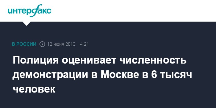 Москва. 12 июня. INTERFAX.RU - В оппозиционной акции в центре Москвы приняло участие шесть тысяч человек, сообщили "Интерфаксу" в пресс-службе главного управления МВД РФ по Москве. "На пике мероприятия принимало участие около шести тысяч человек. Существенного нарушения общественного порядка зафиксировано не было", - сказали в пресс-службе.