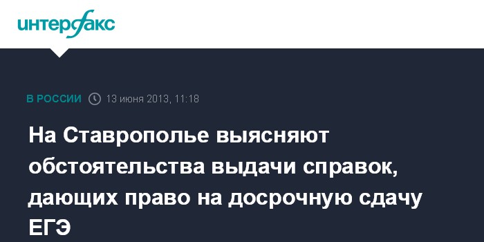 Москва. 13 июня. INTERFAX.RU - Ставропольские следователи проверяют обстоятельства выдачи семи выпускникам школы справок о необходимости госпитализации на период проведения ЕГЭ, сообщил "Интерфаксу" официальный представитель СК РФ Владимир Маркин.