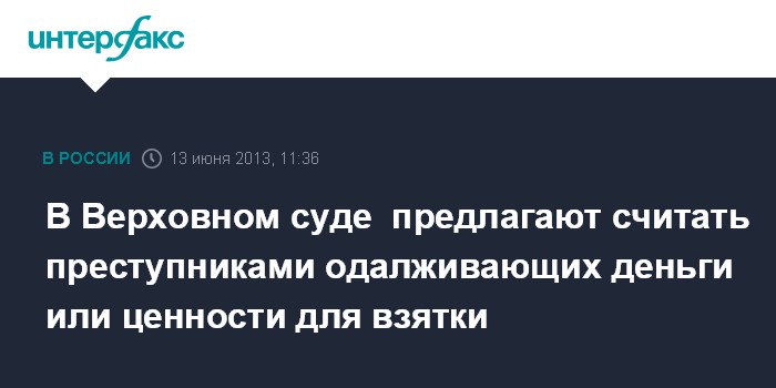 Москва. 13 июня. INTERFAX.RU - Предоставление в долг денег, которые будут использованы для дачи взятки, должно квалифицироваться как преступление, считает Верховный суд России.