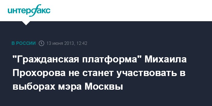 Москва. 13 июня. INTERFAX.RU - "Гражданская платформа" не будет участвовать в выборах мэра Москвы, и сосредоточится на будущей избирательной кампании в Мосгордуму, сообщил лидер партии Михаил Прохоров.