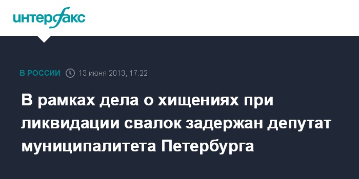 Санкт-Петербург. 13 июня. INTERFAX.RU - В Санкт-Петербурге в рамках расследования уголовного дело о хищении свыше 170 млн бюджетных средств при ликвидации свалок задержан депутат Вадим Пичулин, находящийся в федеральном розыске, сообщает пресс-служба СКР.