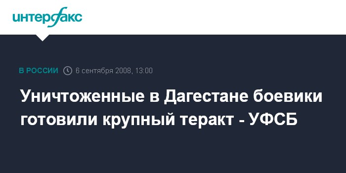Махачкала. 6 сентября. INTERFAX.RU - Убитые в четверг в ходе спецоперации в дагестанском городе Хасавюрт пятеро боевиков из верхушки хасавюртовского бандподполья готовили крупный теракт, сообщили в группе общественных связей УФСБ по Дагестану.