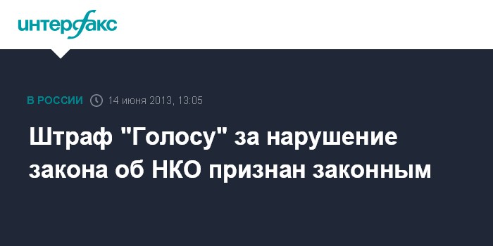 Москва. 14 июня. INTERFAX.RU - Пресненский суд Москвы в пятницу признал законным решение нижестоящей инстанции, которая назначила штраф в 300 тысяч рублей ассоциации "Голос" за нарушение закона об НКО.