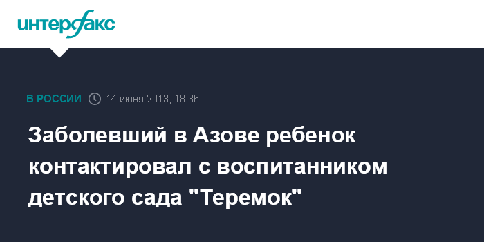Москва. 14 июня. INTERFAX.RU - Следственный комитет установил, что пятилетний ребенок заразился энтеровирусной инфекцией в Азове Ростовской области после контакта с один воспитанником детского сада № 83 "Теремок" Ростова-на-Дону, где и была зафиксирована болезнь, сообщает СКР.