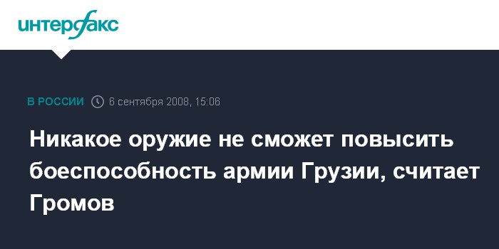 Москва. 6 сентября. INTERFAX.RU - Губернатор Подмосковья генерал Борис Громов уверен, что самые новейшие вооружения, если они будут поставлены в Грузии, не повысят боеспособность армии этой страны.