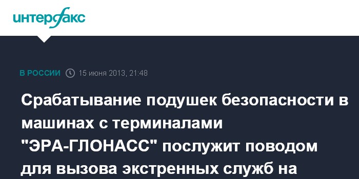 Казань. 15 июня. ИНТЕРФАКС-АВН - Срабатывание подушек безопасности в автомобиле, оборудованном терминалом системы "ЭРА-ГЛОНАСС", в случае ДТП будет служить поводом для вызова экстренных спасательных служб через данную систему, сообщил "Интерфаксу-АВН" главный конструктор федерального сетевого оператора Некоммерческое партнерство "ГЛОНАСС", отвечающего за внедрение системы "ЭРА-ГЛОНАСС" в России, Александр Разговоров.