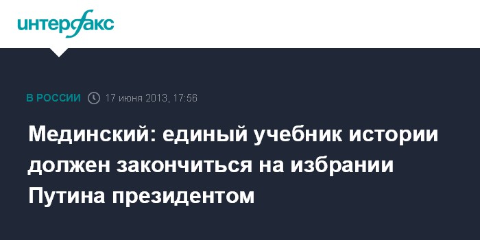 Москва. 17 июня. INTERFAX.RU - Единый учебник отечественной истории должен заканчиваться событиями 2000 года, а последующие развитие страны следует отнести к современности, заявил министр культуры РФ Владимир Мединский.