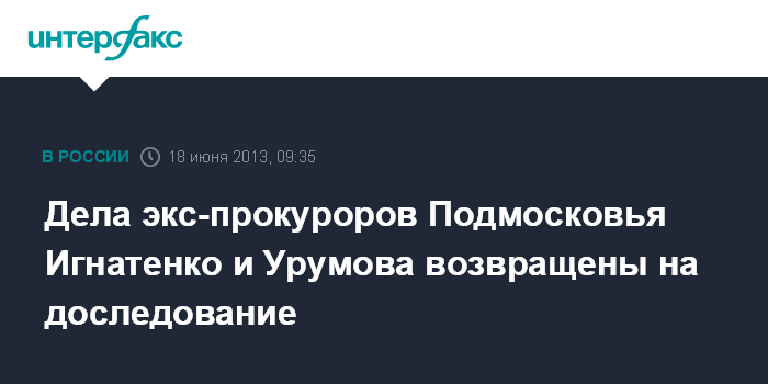 Москва. 18 июня. INTERFAX.RU - Генеральная прокуратура России вернула в Следственный комитет России на доследование уголовные дела в отношении бывшего первого заместителя прокурора Московской области Александра Игнатенко и бывшего начальника управления этой прокуратуры Дмитрия Урумова.