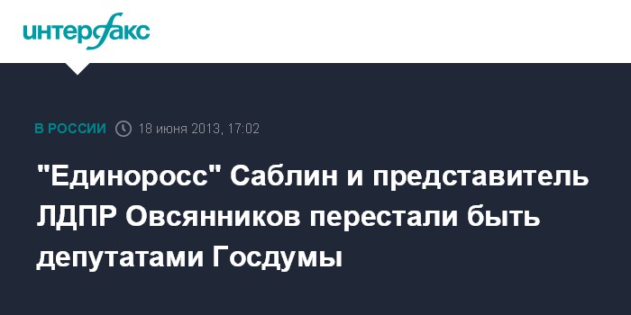 Москва. 18 июня. INTERFAX.RU - Госдума во вторник досрочно прекратила депутатские полномочия единоросса Дмитрия Саблина и первого заместителя руководителя фракции ЛДПР Владимира Овсянникова, которые сдали мандаты "по собственному желанию".
