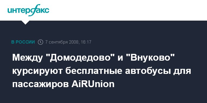 Москва. 7 сентября. INTERFAX.RU – Рейсы авиационного альянса AiRUnion, вылетающие из Москвы, перенесены из аэропорта "Домодедово" в аэропорт "Внуково, в связи с чем между двумя терминалами курсируют бесплатные автобусы.