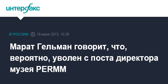 Москва. 19 июня. INTERFAX.RU - Галерист Марат Гельман, вероятно, лишился поста директора музея современного искусства PERMM, об этом он сообщил в своем микроблоге в "Твиттере".
