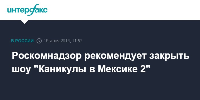 Москва. 19 июня. INTERFAX.RU - Экспертная комиссия Роскомнадзора считает, что телепроект "Каникулы в Мексике" содержит информацию, способную причинить вред здоровью и развитию детей.