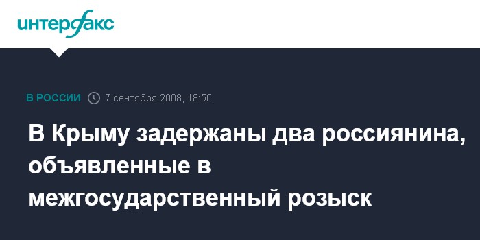 Москва. 7 сентября. INTERFAX.RU – В Феодосии (Крым) в воскресенье были задержаны два гражданина России, которые находились в межгосударственном розыске, сообщила агентству "Интерфакс-Украина" пресс-секретарь Главного управления по борьбе с организованной преступностью МВД Украины Елена Мельник.
