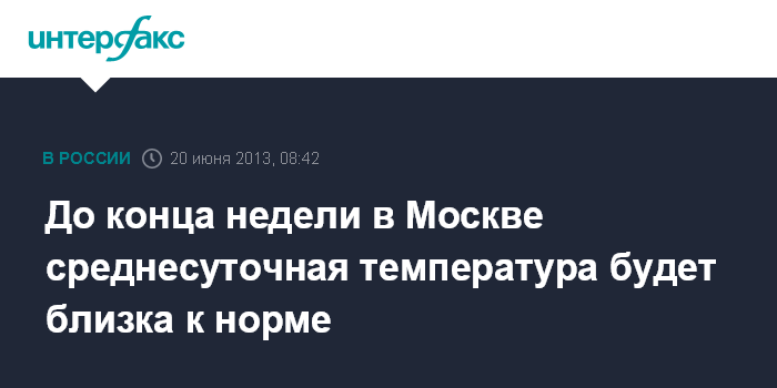 Москва. 20 июня. INTERFAX.RU - В четверг и, как минимум, до конца недели среднесуточная температура будет близка к климатической норме, сообщили "Интерфаксу" в Гидрометеобюро Москвы и Московской области.