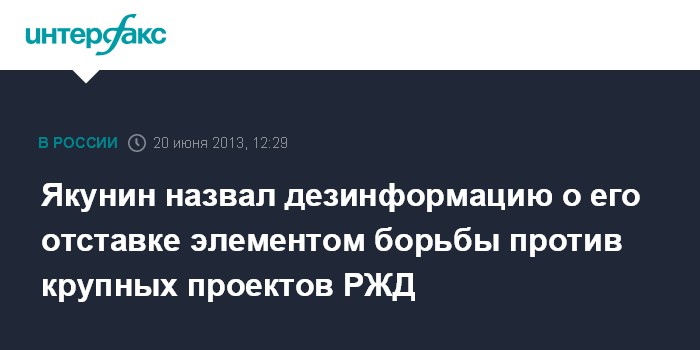 Санкт-Петербург. 20 июня. INTERFAX.RU - Распространение дезинформации об отставке Владимира Якунина - часть кампании не только против него самого, но и против крупных проектов ОАО "РЖД", считает глава железнодорожной госкомпании.