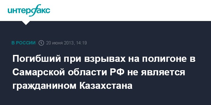 Астана. 20 июня. INTERFAX.RU - Информация о том, что на полигоне в Чапаевске в Самарской области РФ в результате взрыва снарядов погиб гражданин Казахстана, не подтвердилась, сообщил пресс-секретарь МИД республики Нуржан Айтмаханов.