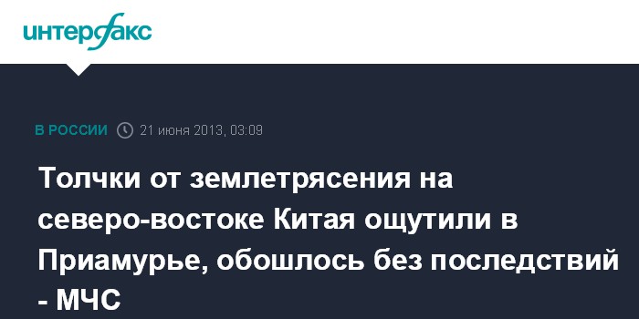 Владивосток. 21 июня. ИНТЕРФАКС-ДАЛЬНИЙ ВОСТОК - В городах пограничной с Китаем Амурской области ощущались толчки от землетрясения, которое произошло накануне на северо-востоке КНР, сообщает в пятницу МЧС Приамурья.