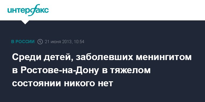 Санкт-Петербург. 21 июня. INTERFAX.RU - Состояние всех госпитализированных в Ростове-на-Дону детей с диагнозом серозный менингит или подозрением на это заболевание в настоящее время не вызывает опасений у врачей, сообщила министр здравоохранения РФ Вероника Скворцова журналистам в ходе Петербургского международного экономического форума в пятницу.