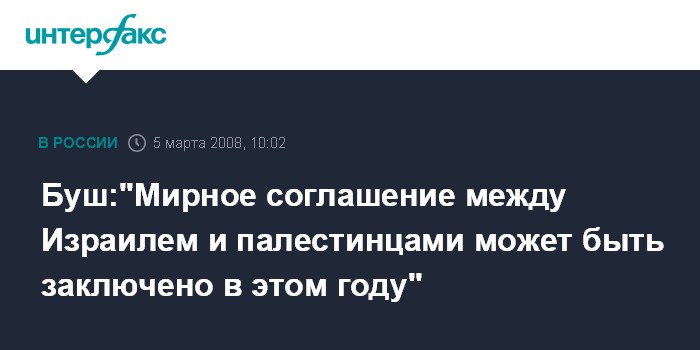 Вашингтон. 5 марта. INTERFAX.RU - Президент США Джордж Буш по-прежнему оптимистично оценивает перспективы заключения мирного соглашения между Израилем и палестинцами, которое, по его мнению, может состояться до окончания срока его президентских полномочий в январе 2009 года.