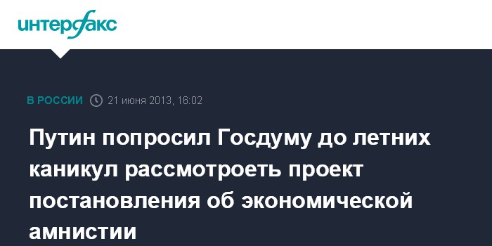 Санкт-Петербург. 21 июня. INTERFAX.RU - Президент РФ Владимир Путин просит Госдуму РФ рассмотреть и поддержать до летних каникул подготовленный проект постановления об экономической амнистии.