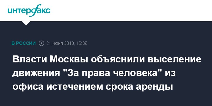 Москва. 21 июня. INTERFAX.RU - Высвобождение офиса в Малом Кисловском переулке в центре Москвы, где размещалась правозащитная организация движение "За права человека", произведено в пятницу в связи с истечением договора аренды, сообщили в пресс-службе столичного департамента городского имущества.