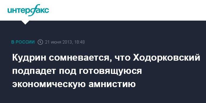 Санкт-Петербург. 21 июня. INTERFAX.RU - Бывший министр финансов России, а ныне руководитель Комитета гражданских инициатив Алексей Кудрин не думает, что готовящаяся экономическая амнистия коснется осужденного экс-главу "ЮКОСа" Михаила Ходорковского.
