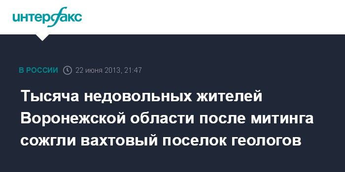 Воронеж. 22 июня. ИНТЕРФАКС-ЦЕНТР - В Новохоперском районе Воронежской области группа радикально настроенных граждан сожгла вахтовый поселок геологов, ведущих разведку никелевых месторождений.