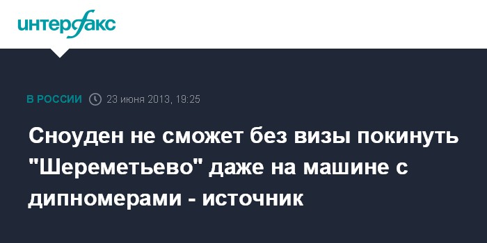 "Э.Сноудена не смогут вывезти из аэропорта даже на машине с дипномерами, поскольку у него нет ни обычной, ни дипломатической визы", - пояснил собеседник агентства.
