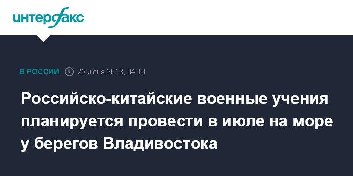 Владивосток. 25 июня. ИНТЕРФАКС-ДАЛЬНИЙ ВОСТОК - Российско-китайские учения на море "Морское взаимодействие - 2013" планируется провести с 5 по 12 июля в акватории залива Петра Великого и порта Владивосток, сообщается на сайте ФГУ "Администрация морских портов Приморского края".