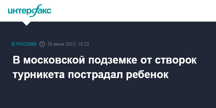 Москва. 25 июня. INTERFAX.RU - Маленький мальчик попал в больницу после того, как ему зажало голову створками турникета на станции "Дмитровская" московского метро, сообщил "Интерфаксу" во вторник источник в медицинских кругах столицы.