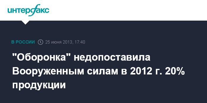 Москва. 25 июня. INTERFAX.RU - Предприятия российского Оборонно- промышленного комплекса (ОПК) недопоставили в 2012 г. Вооруженным силам около 20% продукции, заявил начальник Управления военных представительств России полковник Олег Степанов в Москве на научно-практической конференции по совершенствованию планирования и реализации государственного оборонного заказа.
